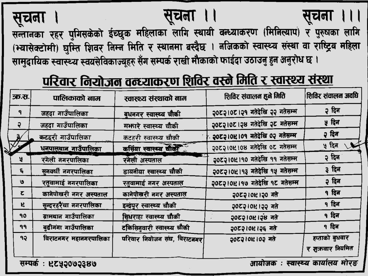 निःशुल्क स्थायी बन्ध्याकरण (मिनिल्याप र भ्यासेक्टोमी) शिविर सम्बन्धी जानकारी