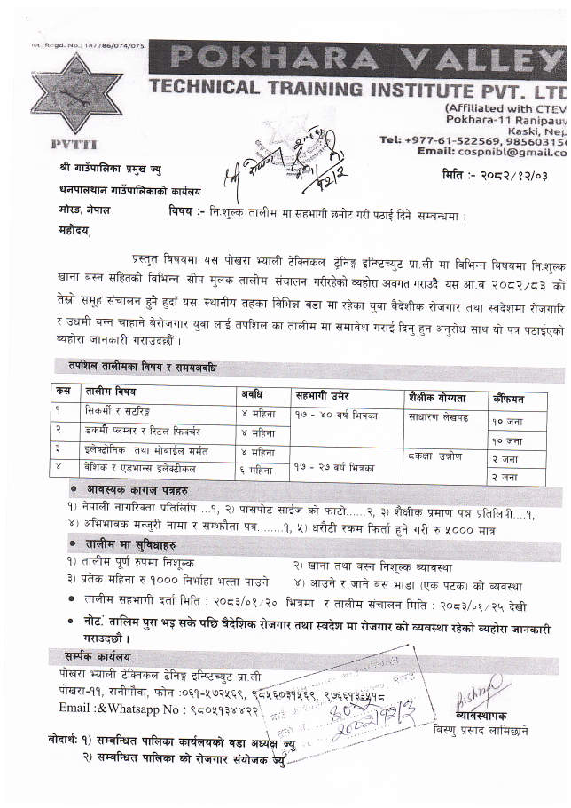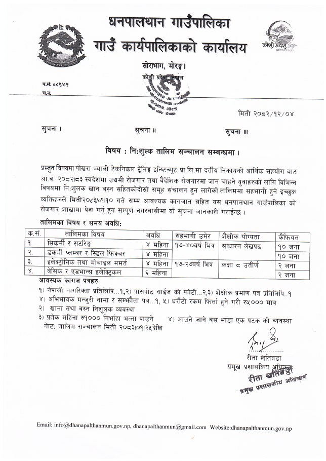 नि: शुल्क तालिम सञ्चालन सम्बन्धमा सूचना!!