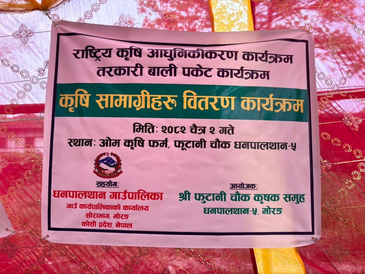 Home » राष्ट्रिय कृषि आधुनिकीकरण कार्यक्रम अन्तर्गत तरकारी बाली पकेट कार्यक्रम मार्फत कृषकहरूलाई आवश्यक कृषि सामग्री वितरण गरिएको हो। यस कार्यक्रमले स्थानीय कृषकहरूको उत्पादन वृद्धि र आधुनिकीकरणमा महत्वपूर्ण सहयोग पुग्ने विश्वास लिइएको छ। स्थान: ओम कृषि फार्म,