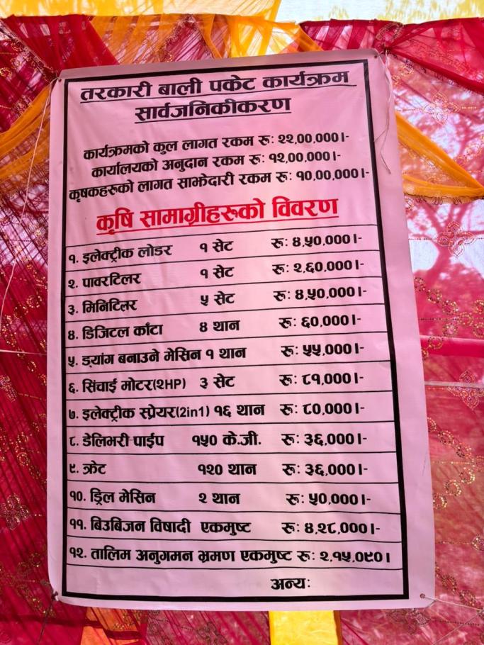 राष्ट्रिय कृषि आधुनिकीकरण कार्यक्रम अन्तर्गत तरकारी बाली पकेट कार्यक्रम मार्फत कृषकहरूलाई आवश्यक कृषि सामग्री वितरण गरिएको हो। यस कार्यक्रमले स्थानीय कृषकहरूको उत्पादन वृद्धि र आधुनिकीकरणमा महत्वपूर्ण सहयोग पुग्ने विश्वास लिइएको छ। स्थान: ओम कृषि फार्म,