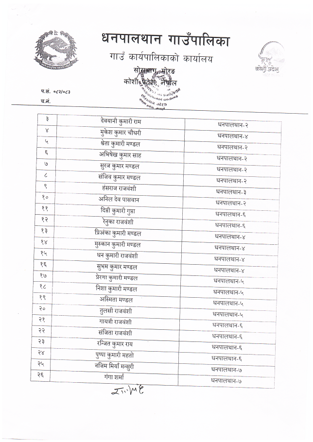 "कृषि, शिक्षा, स्वास्थय उन्नति, पूर्वाधार विकास सहित धनपालथानको समुन्नति "