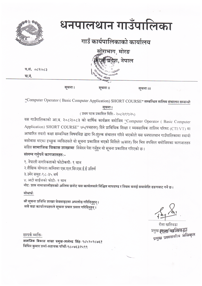 Computer Operator ( Basic Computer Application) SHORT COURSE"सम्बन्धित तालिम संचालन सम्बन्धी सूचना!!!