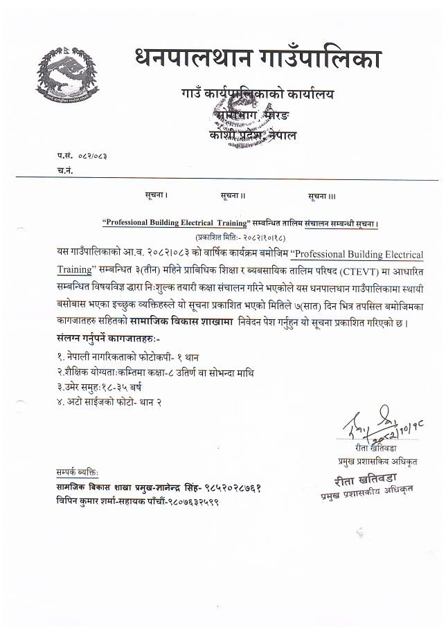 » Professional Building Electrical Training" सम्बन्धित तालिम संचालन सम्बन्धी सूचना!!!