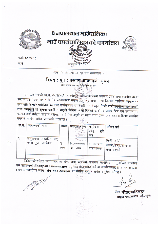 "कृषि, शिक्षा, स्वास्थय उन्नति, पूर्वाधार विकास सहित धनपालथानको समुन्नति "