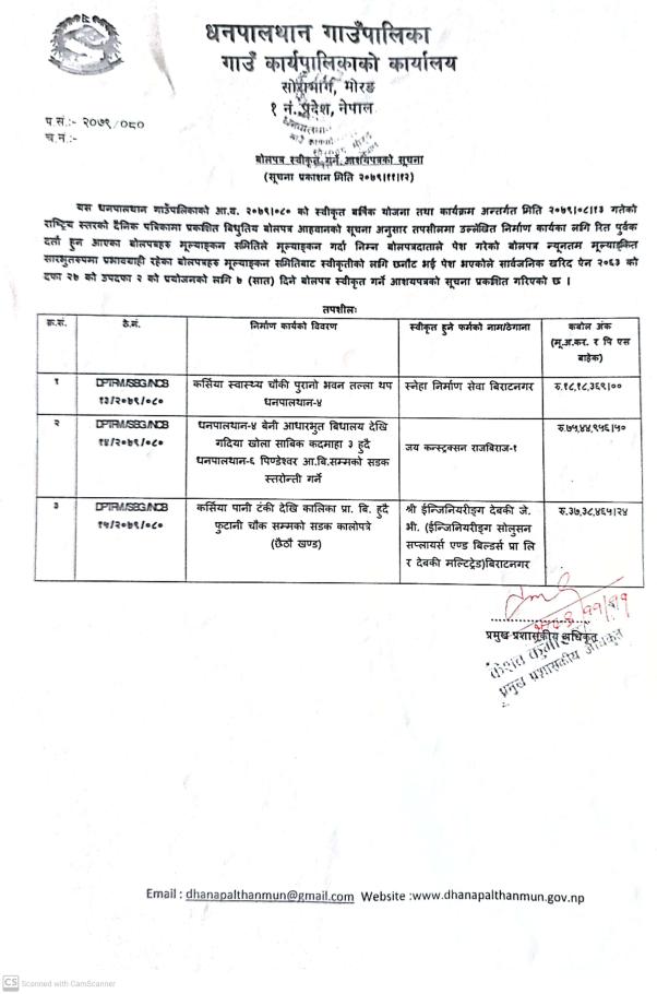 बोलपत्र स्वीकृत गर्ने आशयपत्रको सूचना