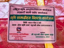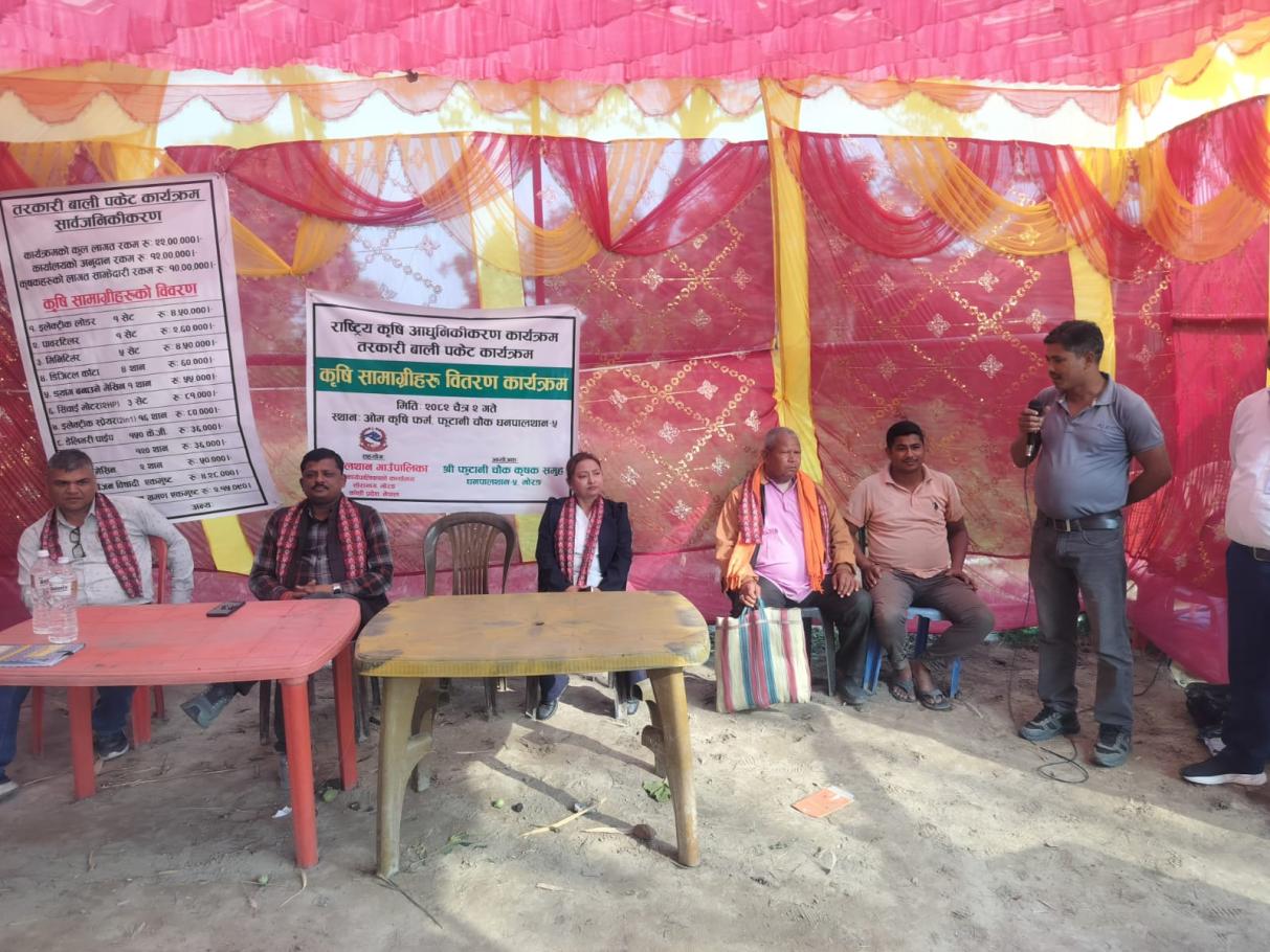 राष्ट्रिय कृषि आधुनिकीकरण कार्यक्रम अन्तर्गत तरकारी बाली पकेट कार्यक्रम मार्फत कृषकहरूलाई आवश्यक कृषि सामग्री वितरण गरिएको हो। यस कार्यक्रमले स्थानीय कृषकहरूको उत्पादन वृद्धि र आधुनिकीकरणमा महत्वपूर्ण सहयोग पुग्ने विश्वास लिइएको छ। स्थान: ओम कृषि फार्म,