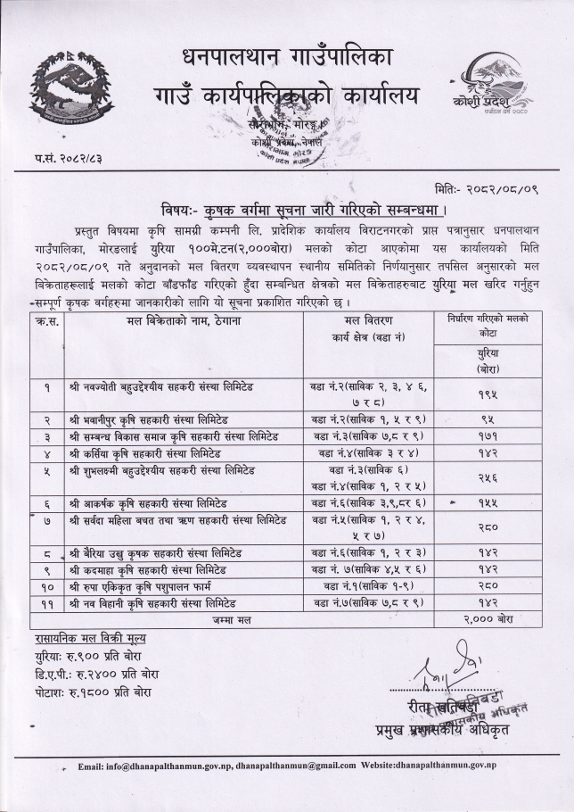 रासायनिक मल सम्बन्धमा सूचना!!!