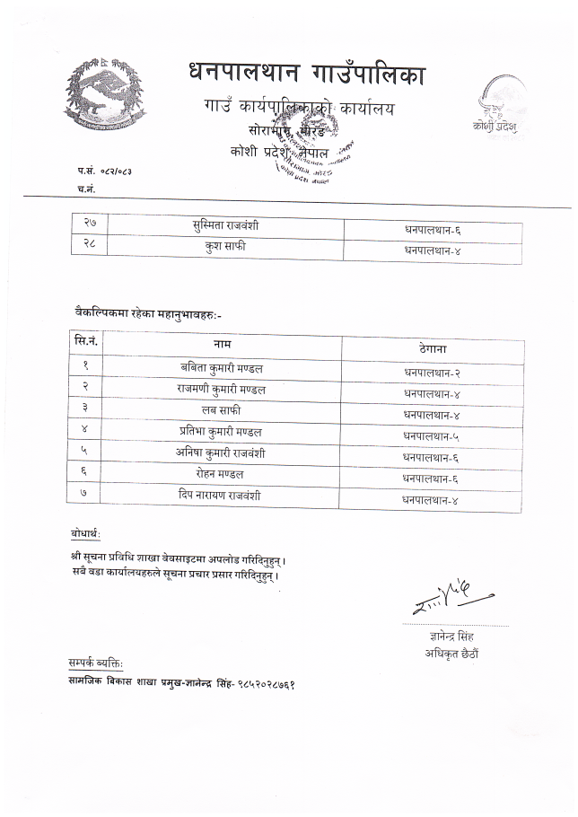 "कृषि, शिक्षा, स्वास्थय उन्नति, पूर्वाधार विकास सहित धनपालथानको समुन्नति "